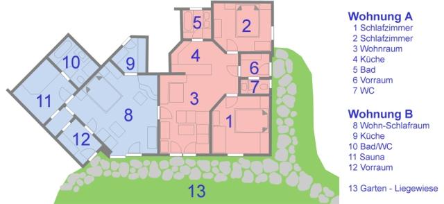 Ubytovanie : Dom poskytuje 2 apartmány A+B, ktoré môžu byť tiež prenajaté dohromady a spojené spojovacími dverami. Ponúka celkovú kapacitu pre jedenásť ľudí.