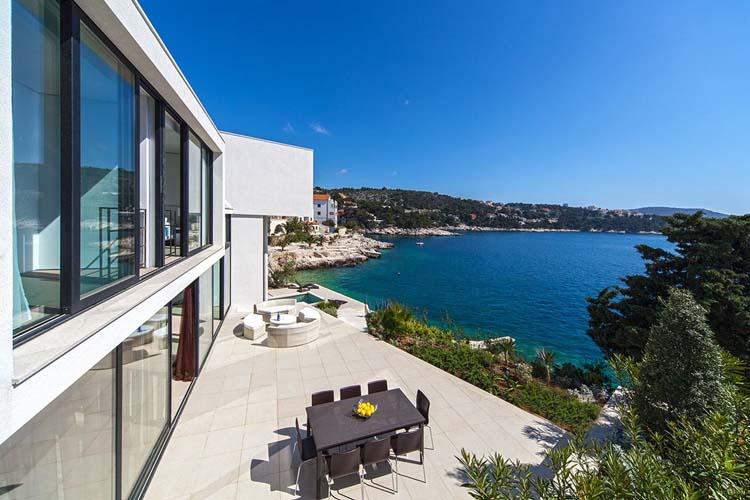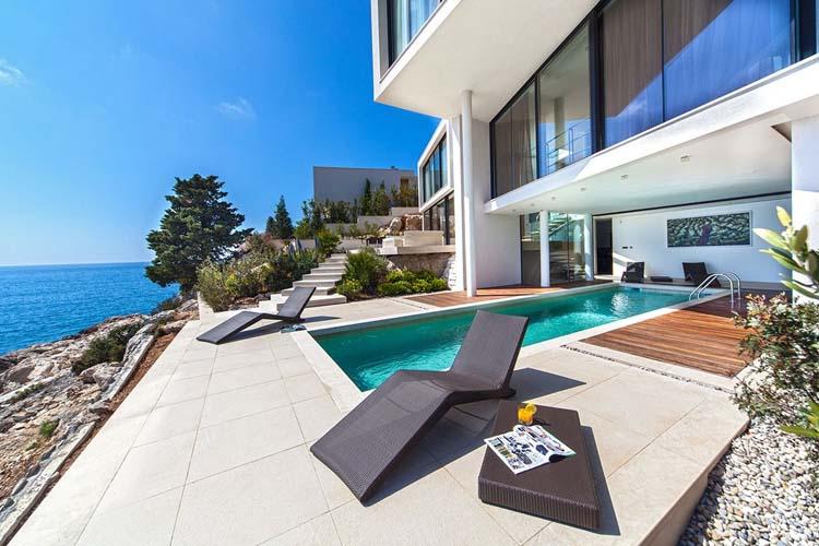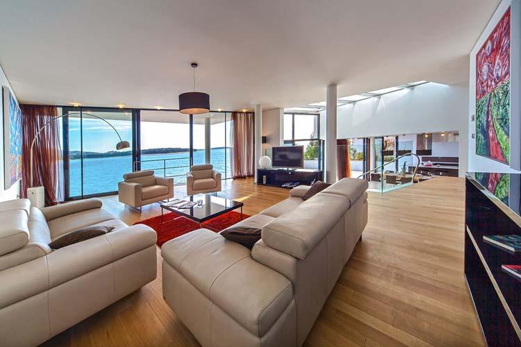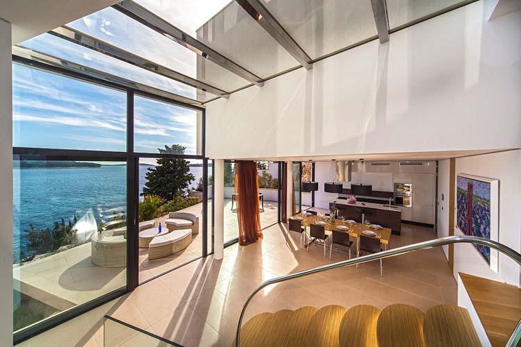 Prízemie a medziposchodie: veľká obývacia izba, jedáleň (124 m2), SAT / LCD TV, veľká terasa s úžasným výhľadom na more (65 m2, obývacia set, lehátka). Otvorená kuchyňa (sporák s štyrmi krúžkom sklokeramickou doskou, rúrou, mikrovlnnou rúrou, mrazničkou, umývačka riadu). Samostatné WC. Skladovacia miestnosť s práčkou a sušičkou. Čiastočne krytý bazén (pravouhlý 9,70 x 2,5 m, 24 m2, hĺbka 1,30 m), sauna so sprchovacím kútom. Terasa, bazén, 25 m2. Prvé poschodie izba s manželskou posteľou (2x90x200 cm), SAT / LCD TV, vlastnou kúpeľňou, francúzsky balkón; izba s 2 lôžkami (2x90x200 cm), SAT / LCD TV, vlastná kúpeľňa, francúzsky balkón.